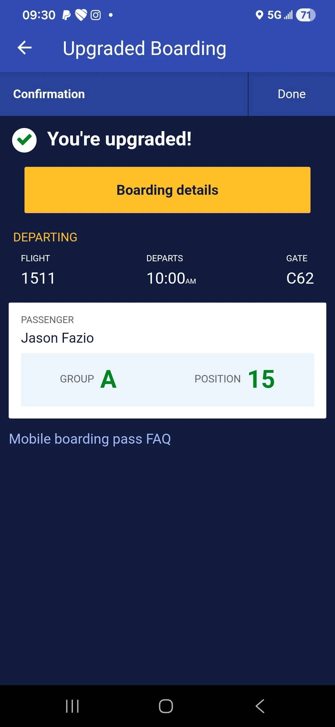 Now, the likelihood of me getting separated from my bag was low, but I didn't want to gamble with over $10k of photography equipment in my bag. With preboarding already happening, I got nervous, pulled out the app and upgraded my boarding position. My new position was A15. That cost me $76, but meant I could surely keep my bag with me. It also meant I could likely "hold" seats for my family. In the end, we all sat together; us and my bag. Yay!