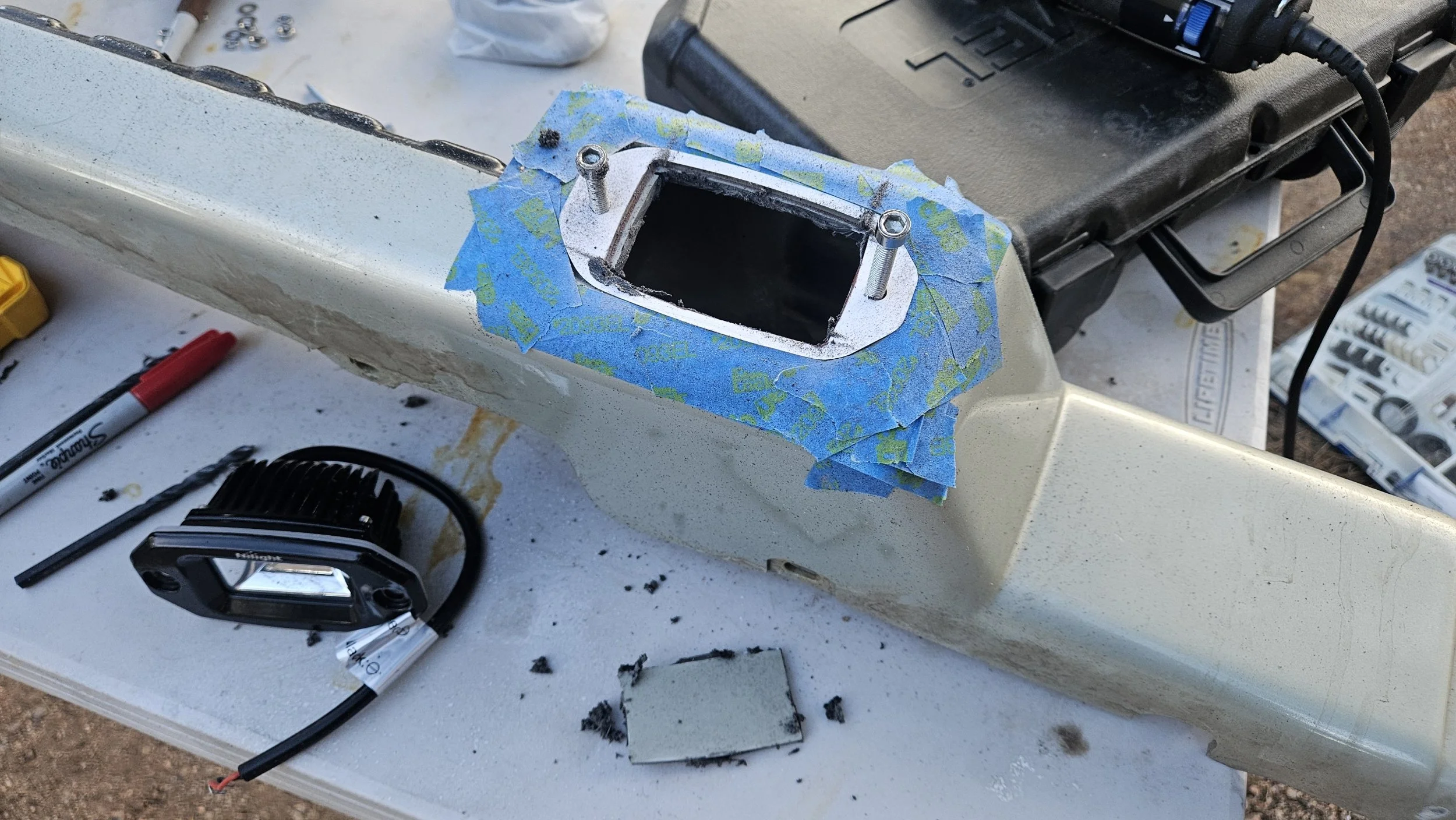 To make it happen, I cut into the rear bumper plastic molding and trimmed out openings for the two lights. Once I started cutting, it became very clear what I was dealing with underneath.